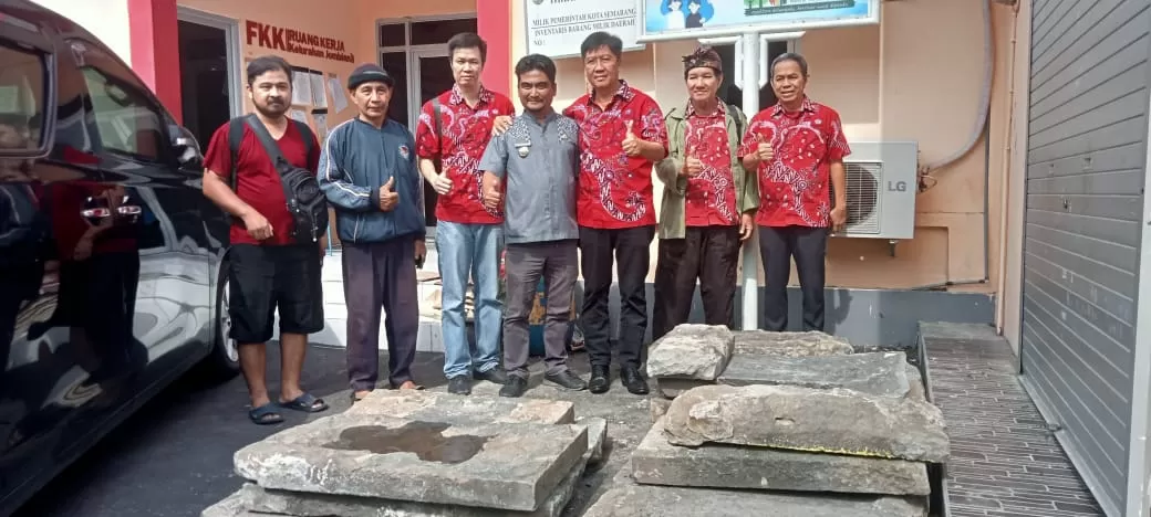 Caption : Ketua PSMTI Jawa Tengah Bambang Wuragil, didampingi beberapa pengurus yang lain berfoto bersama Lurah Jomblang Henry Nurcahyo, usai penyerahan Bongpay atau batu nisan sebanyak 17 buah di depan Balai Kelurahan Jomblang, Kecamatan Candisari, Kota Semarang, Jum’at (15/03/2024). Foto : Absa